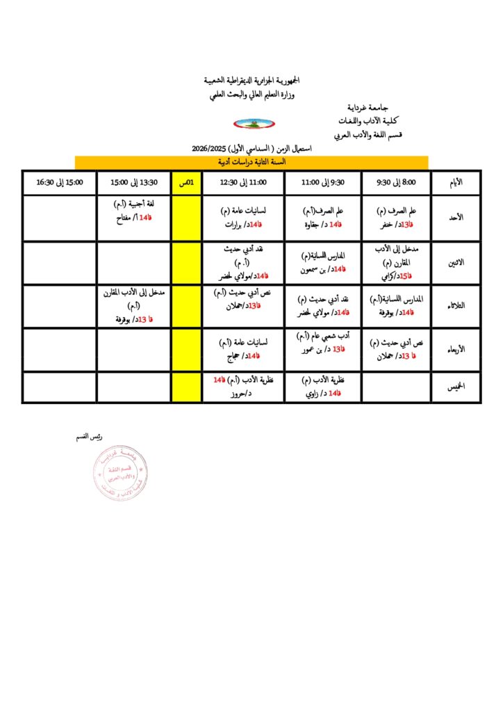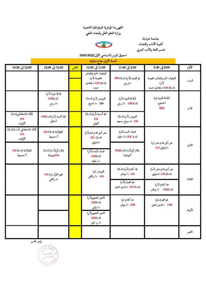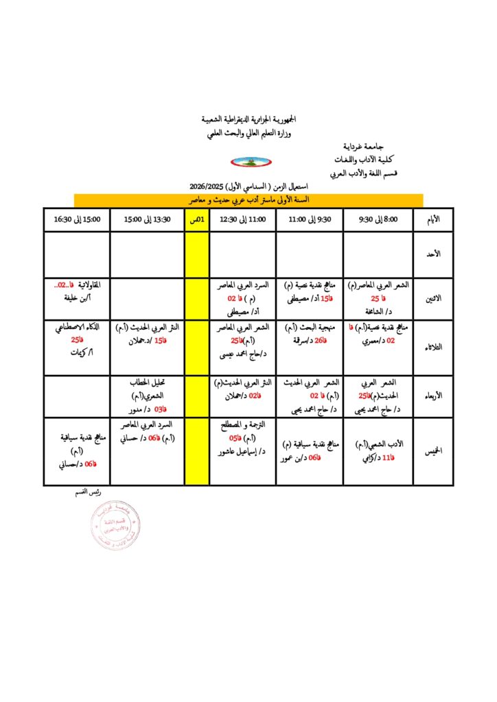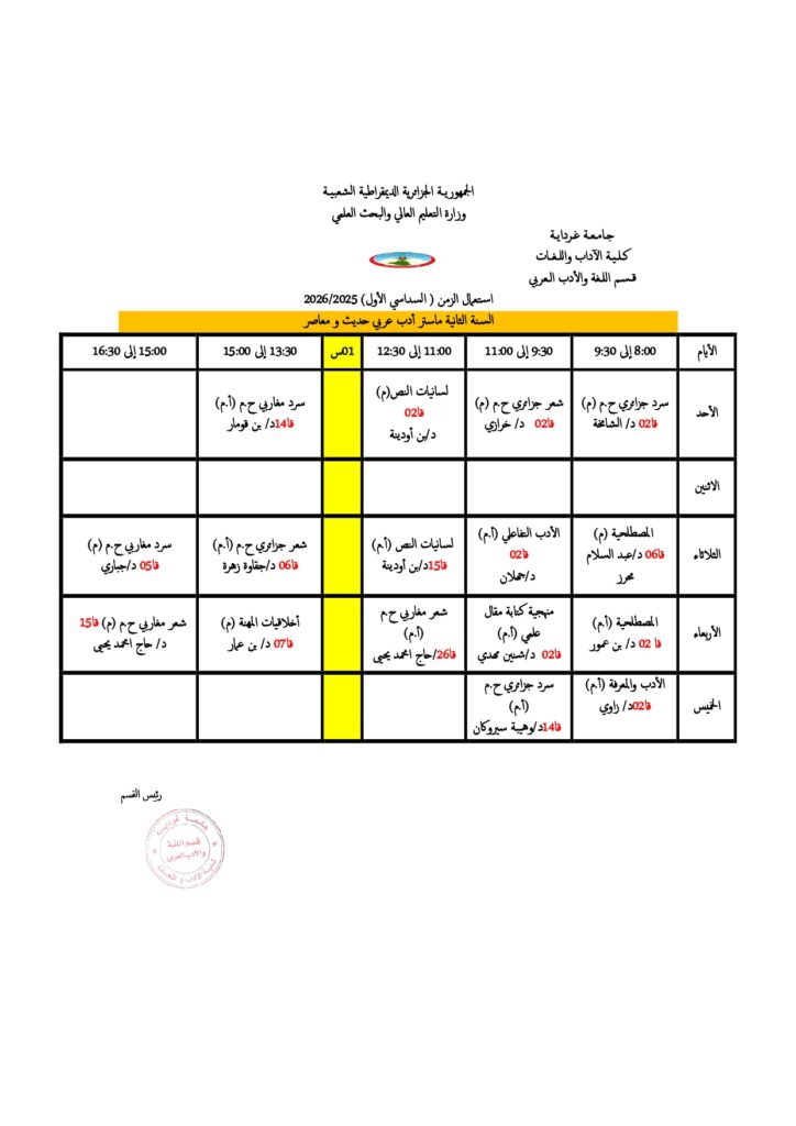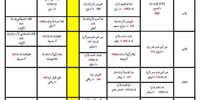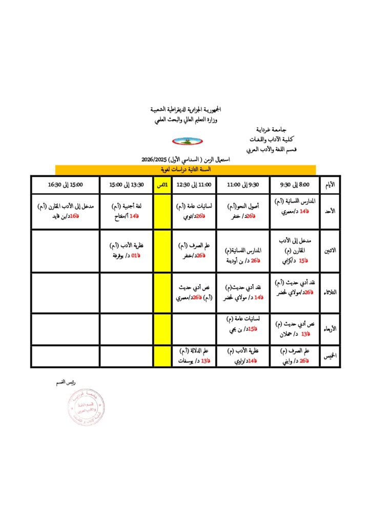قسم اللغة والأدب العربي تعديل في جداول التوقيت الأسبوعي. 18 أكتوبر 2025 إعلانات الطلبة, الجداول الزمنية 5 زيارة شاركها Facebook Twitter LinkedIn