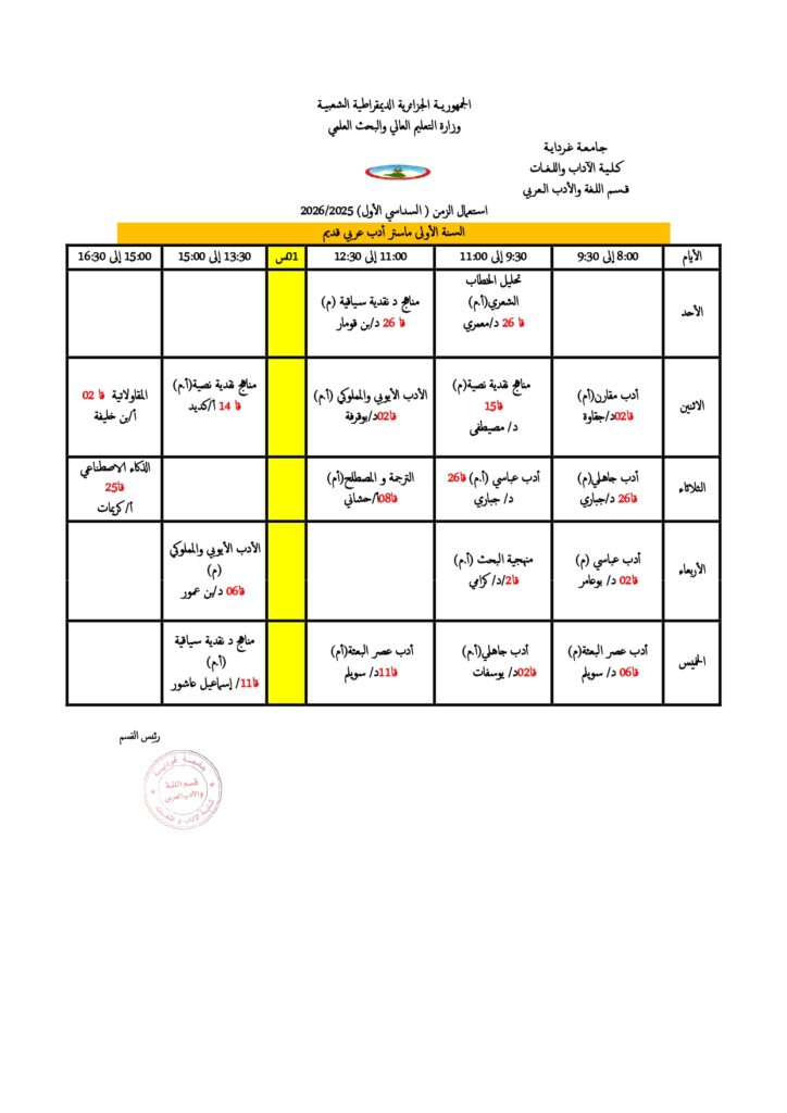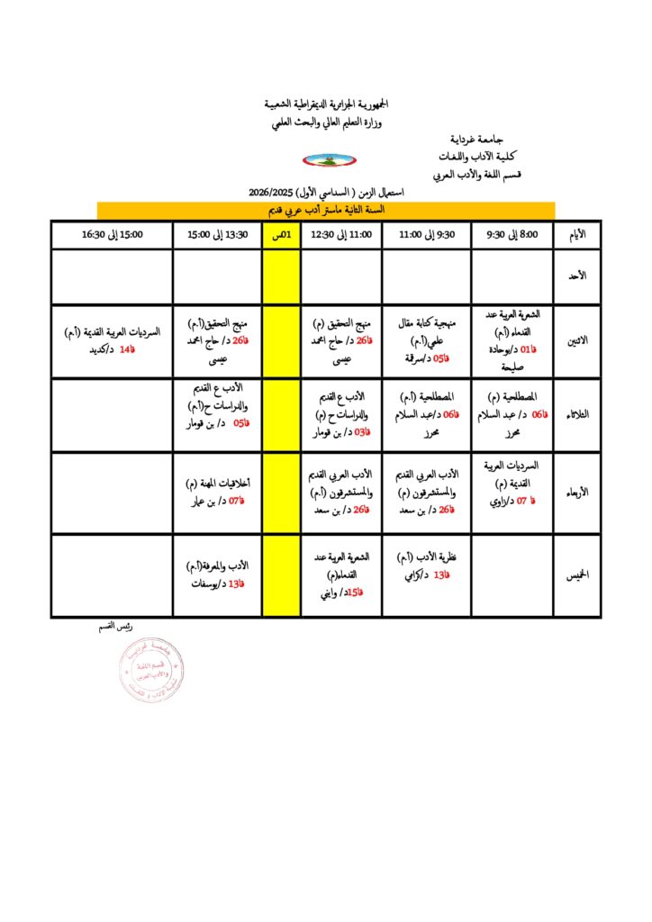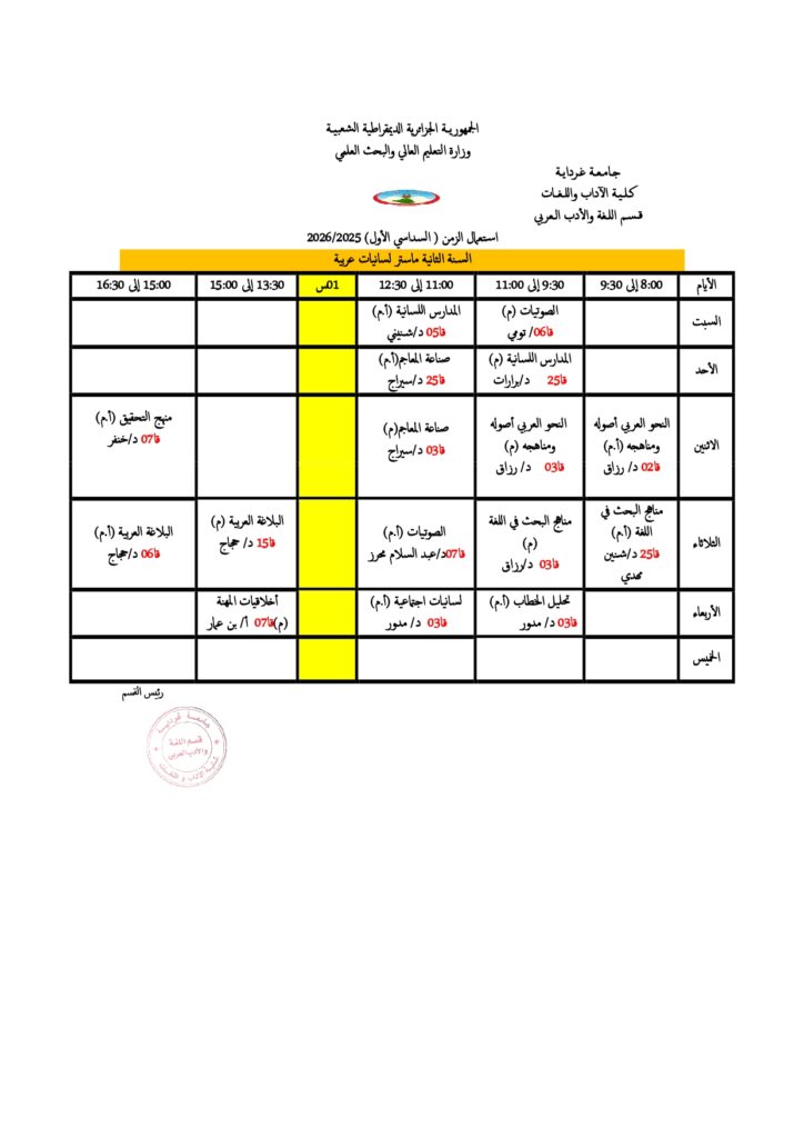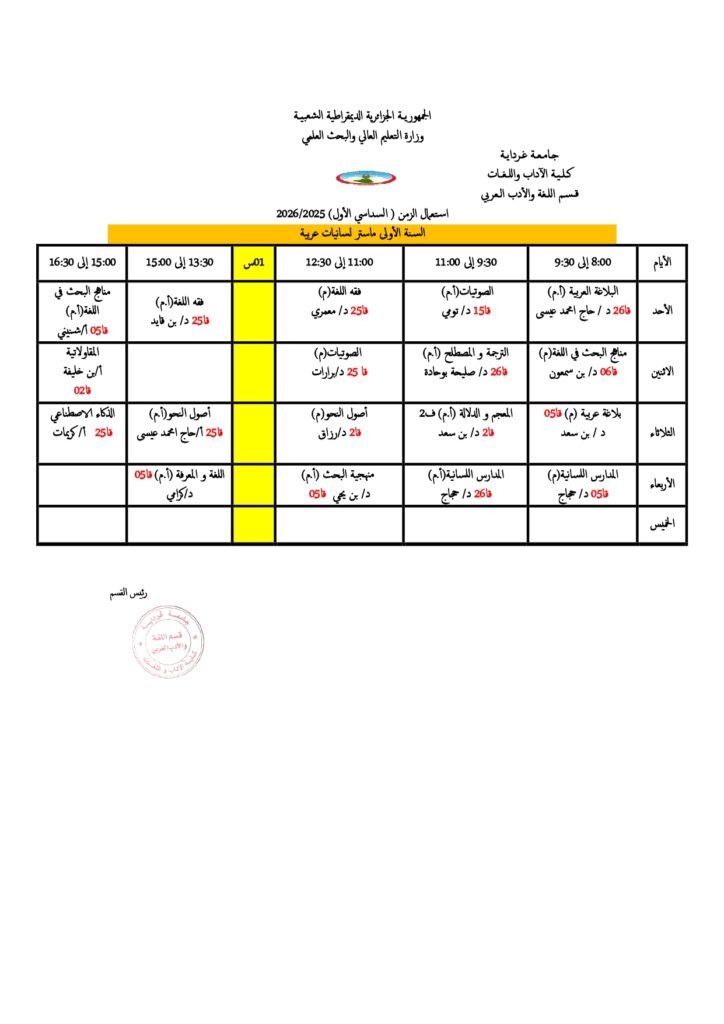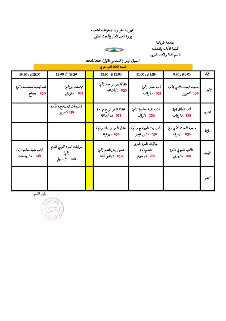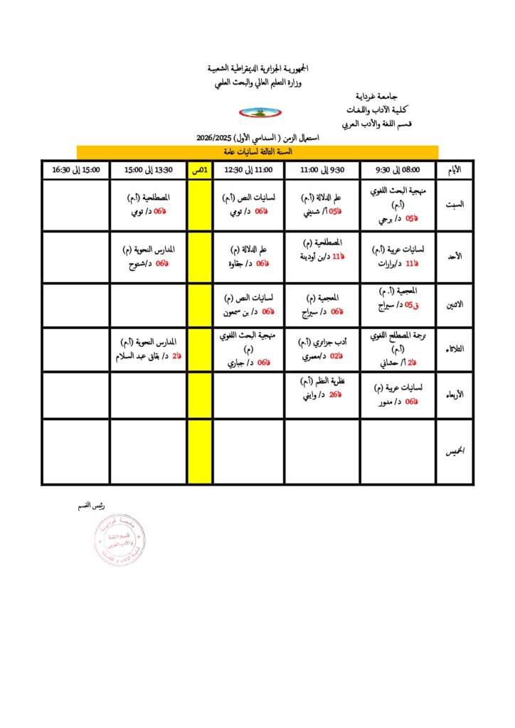 قسم اللغة والأدب العربي تعديل في جداول التوقيت الأسبوعي. 18 أكتوبر 2025 إعلانات الطلبة, الجداول الزمنية 5 زيارة شاركها Facebook Twitter LinkedIn