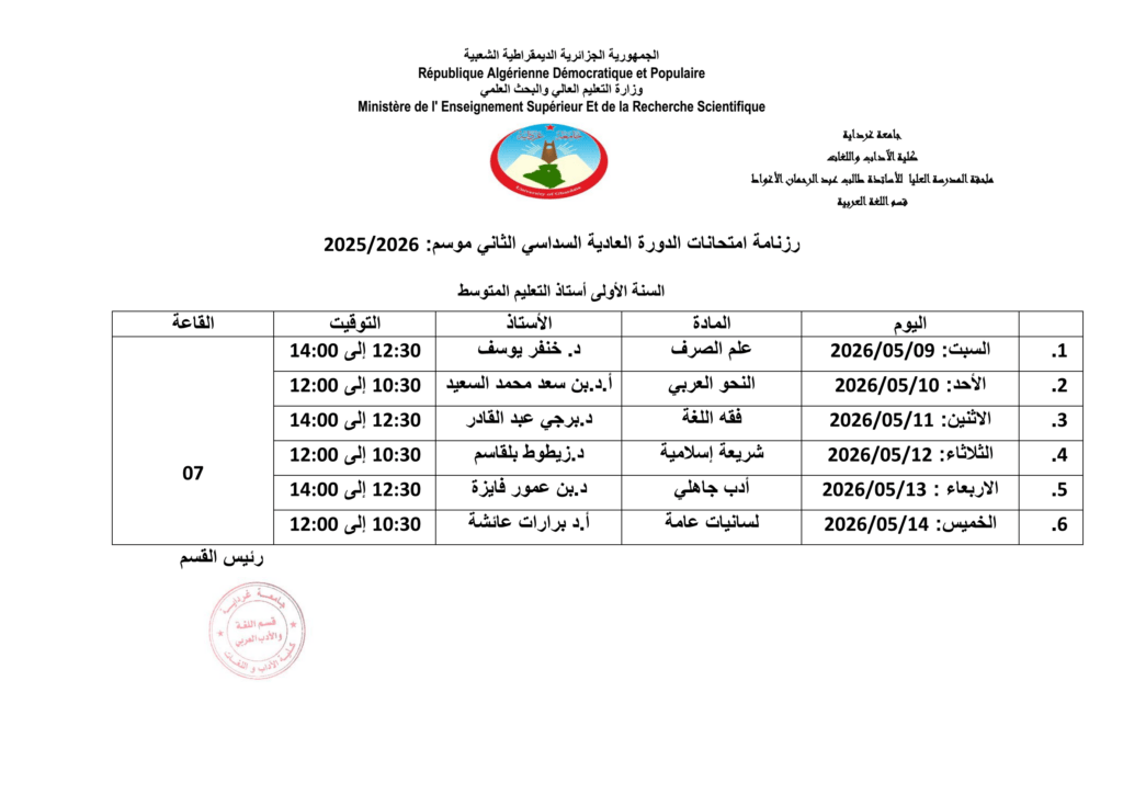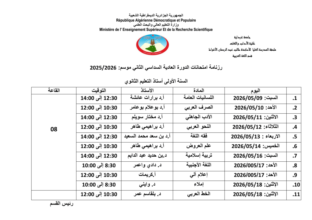 رزنامة امتحانات الدورة العادية للسداسي الثاني – المدرسة العليا – قسم الأدب العربي 30 أبريل 2026 إعلانات الطلبة, رزنامة الإمتحانات 67 زيارة شاركها Facebook Twitter LinkedIn