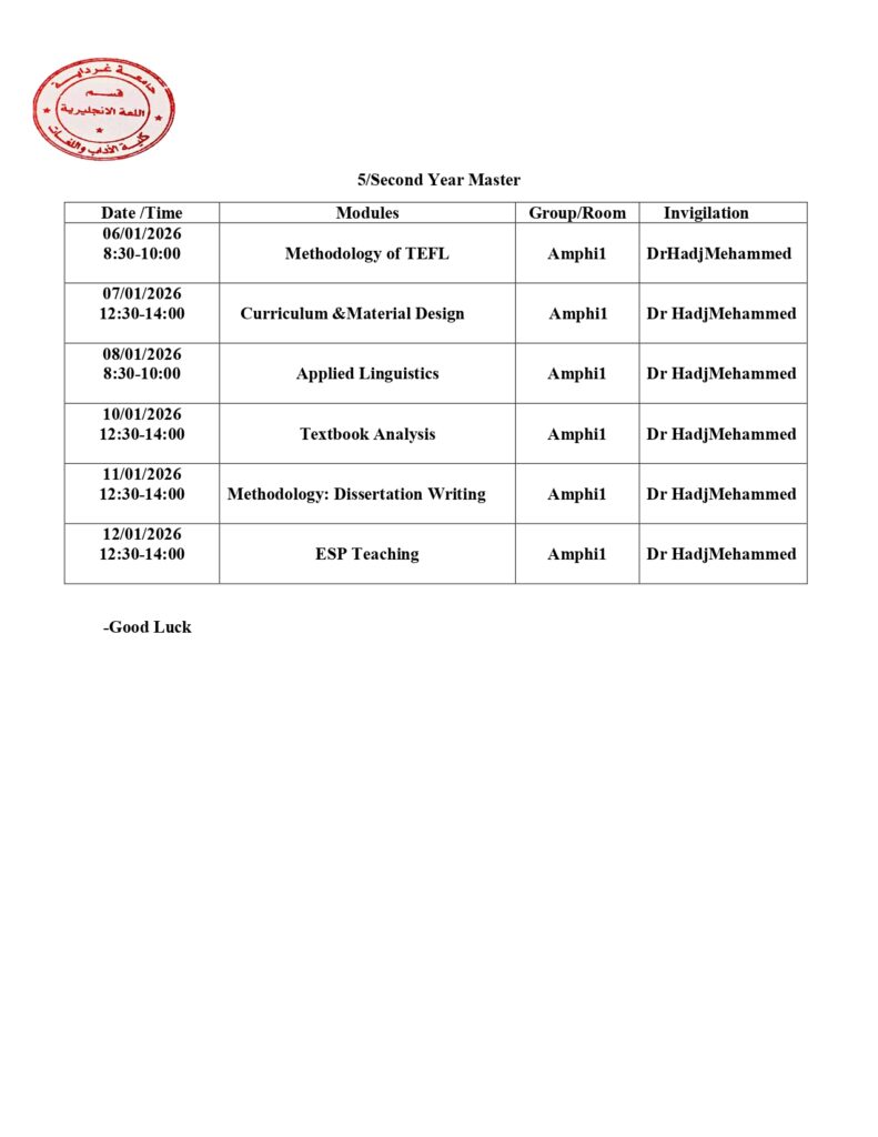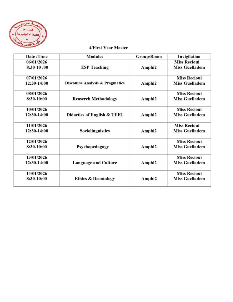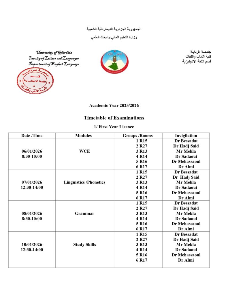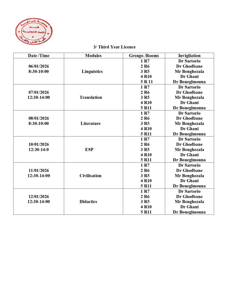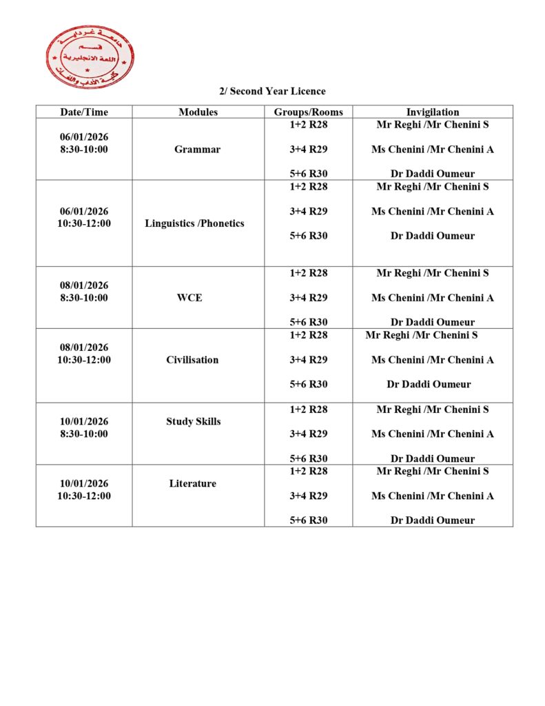 رزنامة امتحانات الدورة العادية للسداسي الأول – قسم اللغة الإنجليزية 23 ديسمبر 2025 إعلانات الطلبة, رزنامة الإمتحانات 7 زيارة شاركها Facebook Twitter LinkedIn