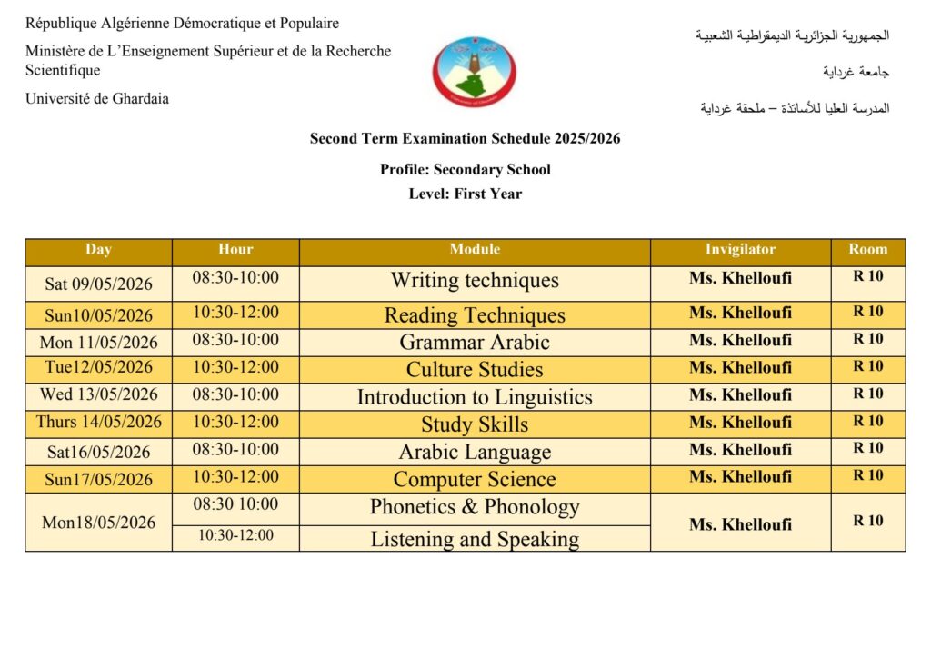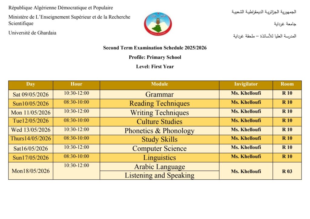 رزنامة امتحانات الدورة العادية للسداسي الثاني – المدرسة العليا – تخصص اللغة الإنجليزية للطورين الإبتدائي والثانوي 30 أبريل 2026 إعلانات الطلبة, رزنامة الإمتحانات 79 زيارة شاركها Facebook Twitter LinkedIn