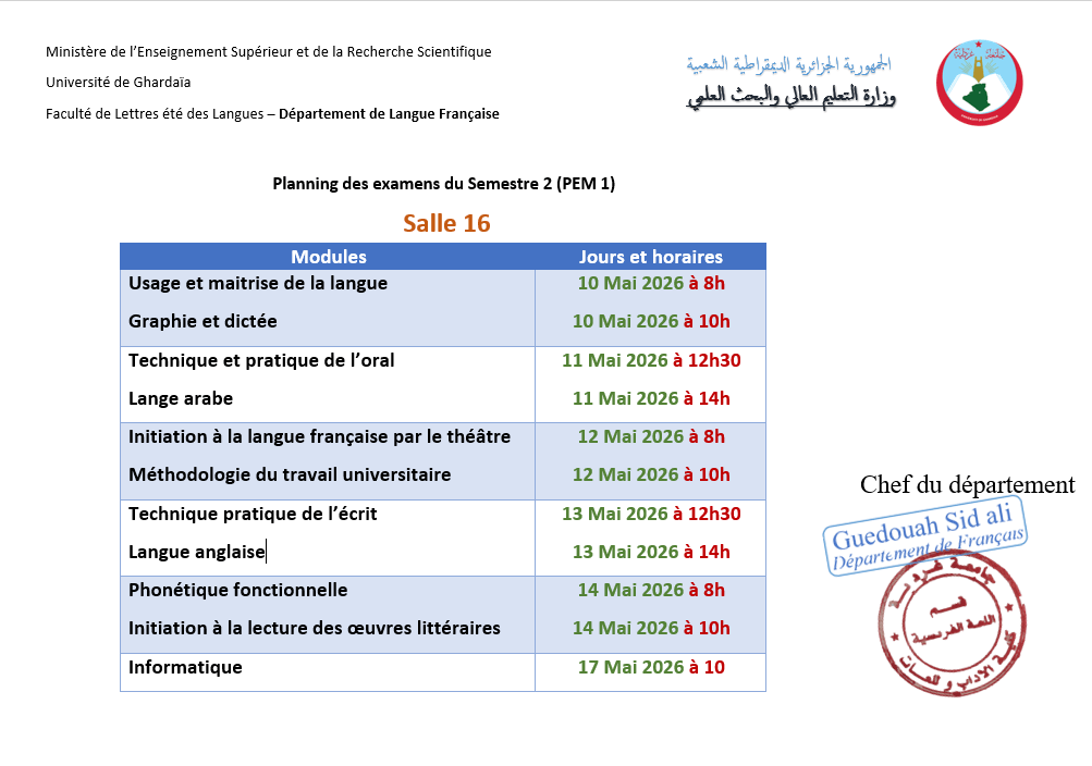 رزنامة امتحانات الدورة العادية للسداسي الثاني – المدرسة العليا – قسم اللغة الفرنسية 30 أبريل 2026 إعلانات الطلبة, رزنامة الإمتحانات 45 زيارة شاركها Facebook Twitter LinkedIn