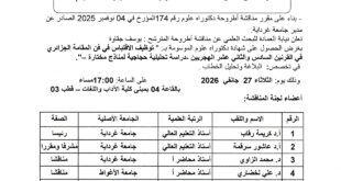 إعلان عن مناقشة رسالة دكتوراه علوم‎