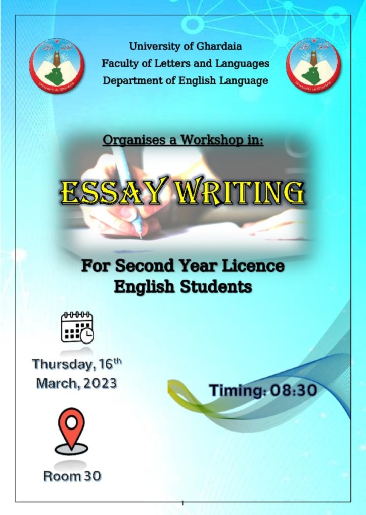 ورشة حول كتابة مقال باللغة الإنجليزية تخص طلبة السنة الثانية ليسانس 16 مارس 2023 إعلانات الطلبة, مقالات مميزة 109 زيارة شاركها Facebook Twitter LinkedIn